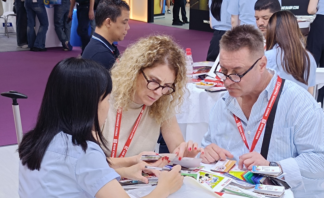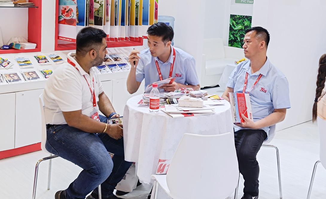 La maggior parte dei clienti è interessata a pannelli in schiuma di PVC, vinile autoadesivo, prodotti ecologici e ai nostri nuovi adesivi magnetici. Alcuni clienti hanno portato i propri campioni e sperano di trovare un fornitore adatto.